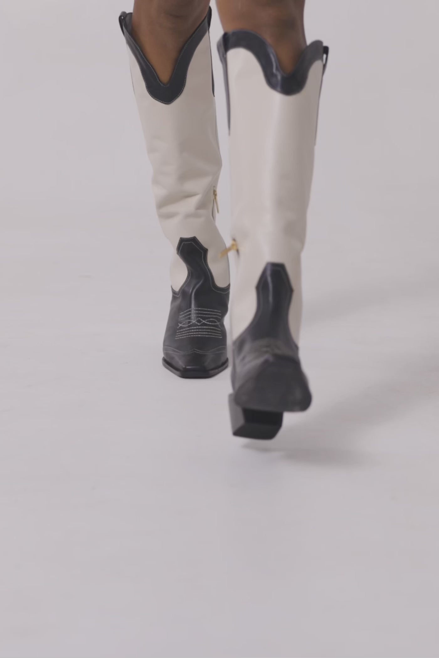 Available in two versions: all black with raised stitching and a gold-tone side zipper, or black with off-white contrast stitching and the same polished zip detail. Designed to make a statement, the Mugui Boots bring bold confidence to every stride.